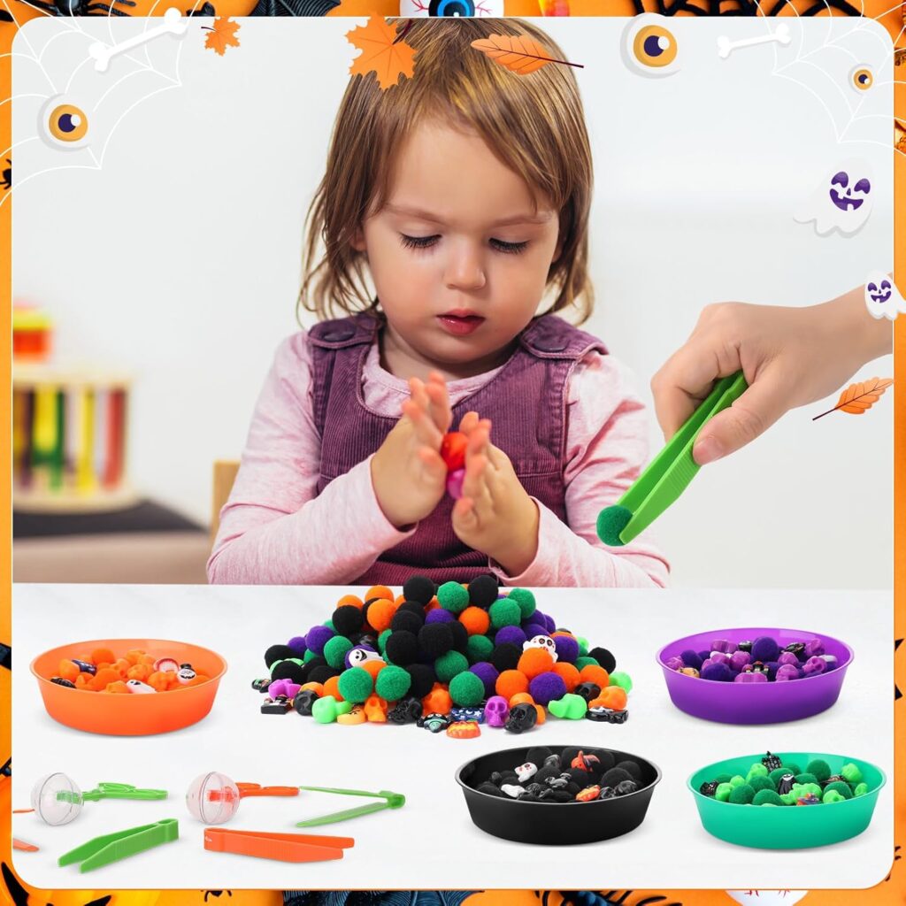 This 195-piece set includes Halloween-themed pom poms, skulls, sorting cups, and tweezers. Perfect for developing fine motor skills while practicing counting and color sorting. My daughter spent over an hour sorting the pieces by color and creating patternsโeducational gold for busy parents!