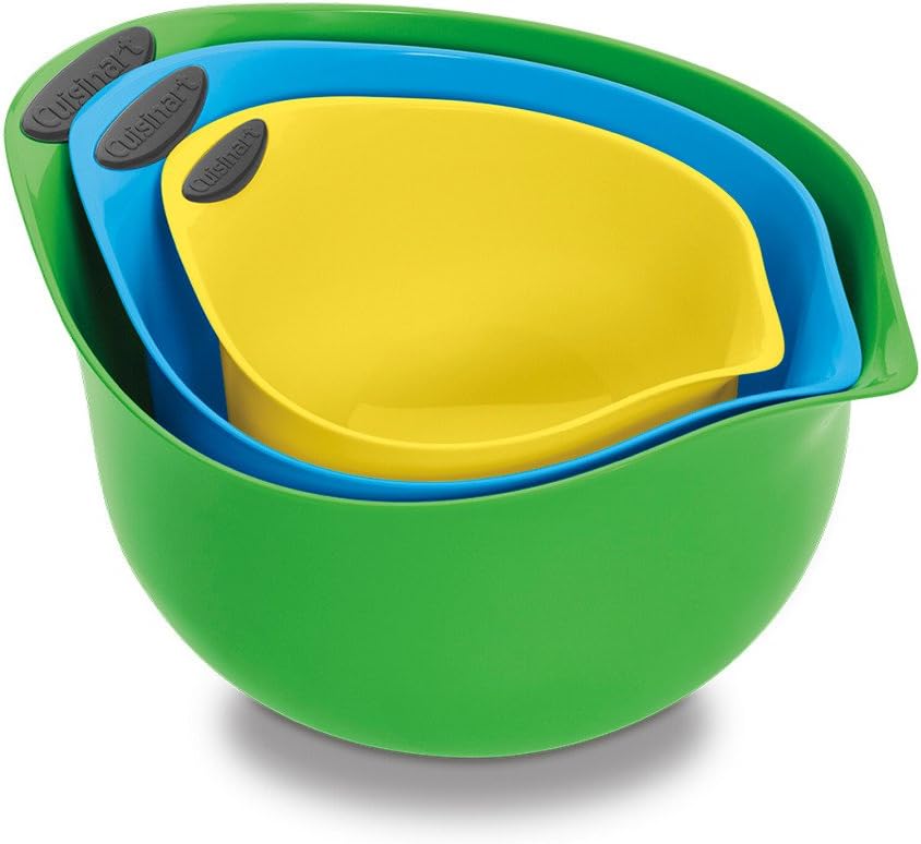 Have a set of lightweight plastic bowls in various sizes that kids can handle easily. The Cuisinart multicolored set in plastic is great because they’re lightweight and have non-slip bottoms. Glass bowls are too heavy and breakable at this age. We found that having kid-specific bowls (maybe in different colors) helps them feel like they have their own kitchen tools.