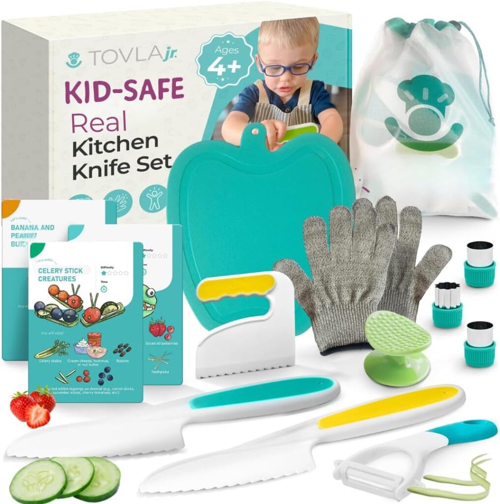 The set usually includes different sizes and a peeler, which gives kids multiple ways to help. My daughter uses these to cut her own banana for breakfast or help prep vegetables for dinner. They’re teaching her proper knife grip and cutting technique without the risks of metal blades.